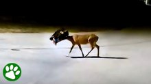 Az őzike bajba került a kutyatáp-kóstolgatás miatt
