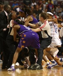 Csetepaté a Los Angeles Sparks - Detroit shock női NBA mérkőzésen. A mérkőzést egyébként a Sparks nyerte 81:84 arányban.